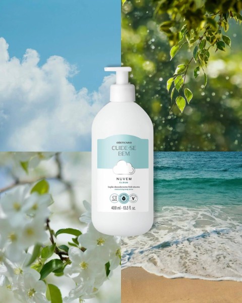 Le Cuide-se Bem Nuvem - 400 ml est une lotion hydratante corporelle qui enveloppe la peau d'une fragrance légère et confortable, évoquant la sensation de fraîcheur d'une douche. Sa formule légère pénètre rapidement sans laisser de film gras, offrant une hydratation durable jusqu'à 96 heures. Elle laisse la peau douce, soyeuse et délicatement parfumée.